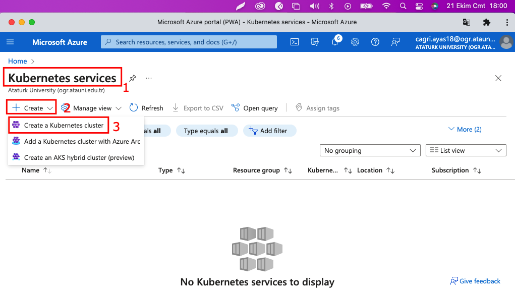 Azure Kubernetes Service (AKS) olarak adlandırılır. AKS, Kubernetes’i yönetmek ve dağıtmak için Azure tarafından sunulan bir hizmettir.